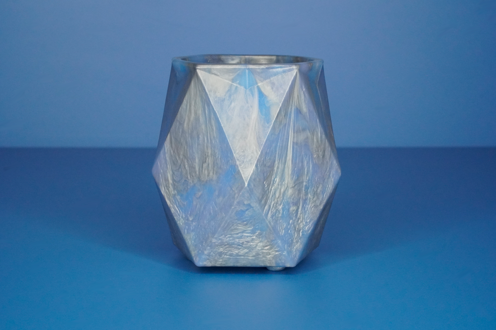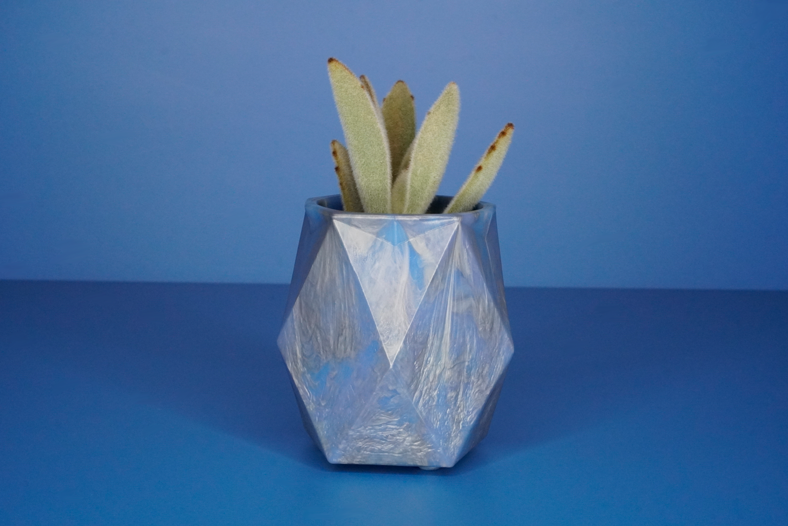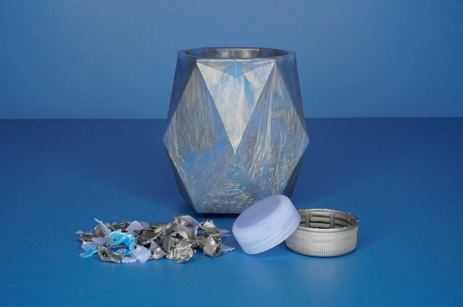 This pot is recycled from approximately forty bottle lids in the colours of silver and translucent blue. That means with this purchase you are helping divert plastic waste from landfill. Thank you for making thoughtful purchases and helping in our mission to go below the tip of the plastic waste iceberg!